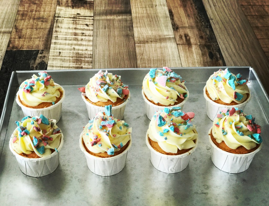 For 24 cupcakes: 250g salted butter, 200g fine caster sugar, 5 eggs, 250g cake flour, 12g baking powder, vanilla extract for flavor.